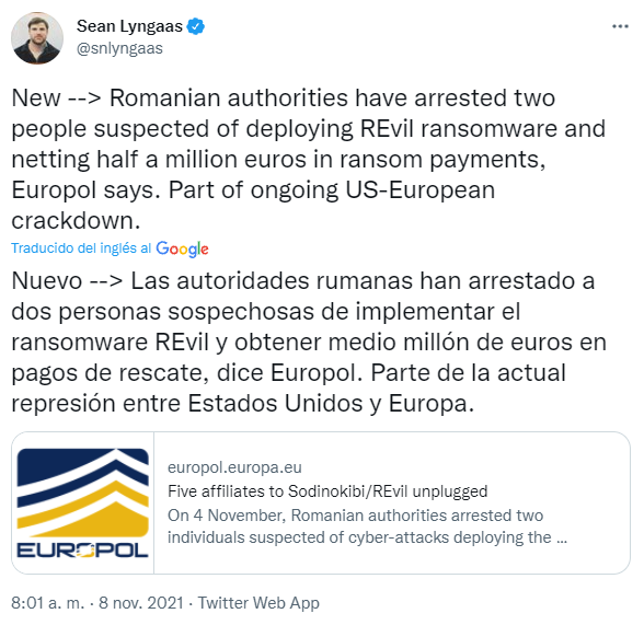 Los últimos dos hackers, vinculados al grupo de ciberdelincuentes REvil, fueron detenidos por la Europol la semana pasada, al igual que otro miembro detenido en Kuwait, mientras que tres más fueron arrestados desde febrero en Corea del Sur, y un séptimo implicado también fue atrapado en Europa en octubre.