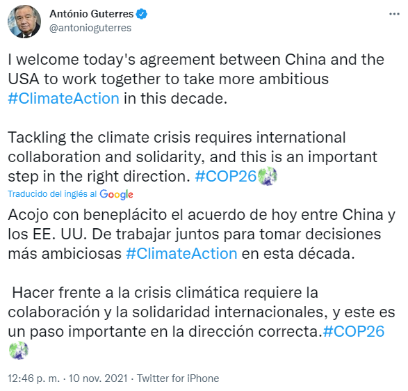 Incluso el secretario general de Naciones Unidas, António Guterres, celebró el acuerdo alcanzado en el marco de la COP26 celebrada en Glasgow, Escocia, donde se reunieron la mayoría de las potencias del mundo para tratar el cambio climático y revisar los avances del Acuerdo de París, y que termina este viernes.