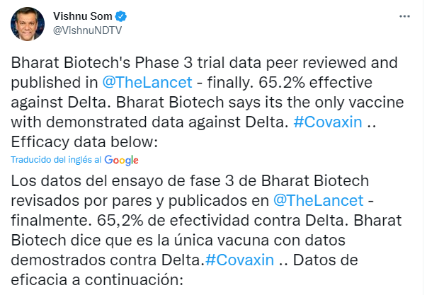 "(Covaxin) es altamente eficaz contra el COVID-19 sintomático (...) en adultos", concluyó el estudio, que añadió que el fármaco indio fue bien tolerada por los voluntarios, que no presentaron efectos secundarios importantes.