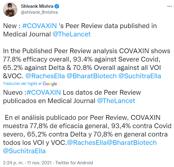 Un estudio publicado en la prestigiosa revista médica británica The Lancet concluyó que la vacuna contra el coronavirus Covaxin, desarrollada por el laboratorio Bharat Biotech y el Consejo Indio de Investigación Médica (ICMR), tiene una efectividad del 77.8%.