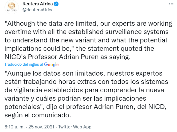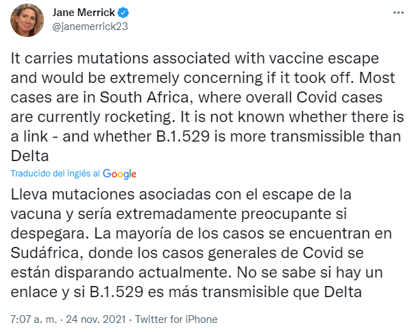 Por último, el especialista agregó que esperan que la Organización Mundial de la Salud (OMS) dé un nuevo nombre de letra griega a esta variante mañana, al igual que se hizo con el resto de las cepas; y recalcó que, aunque la B.1.1.529 se haya detectado por primera vez en Sudáfrica, no significa necesariamente que se haya originado en este país austral.