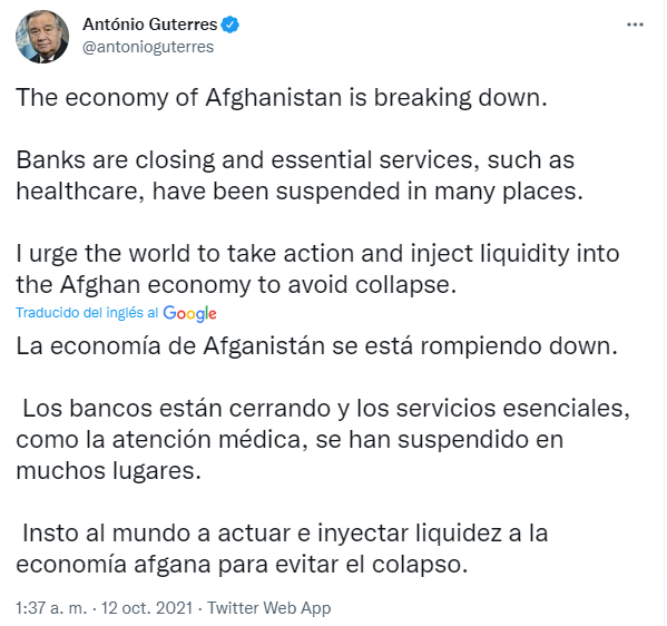 De hecho, Guterres llamó a la comunidad internacional a enviar ayuda económica a Afganistán antes de que su economía se derrumbe.