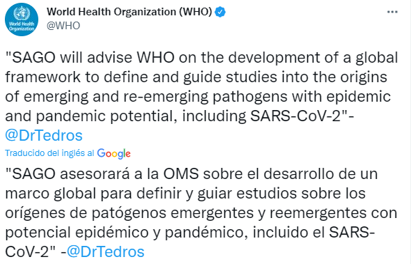 De hecho, varios de los expertos de ese primer grupo participarán ahora en el SAGO, con la misión de esclarecer de una vez por todas el surgimiento del COVID-19.
