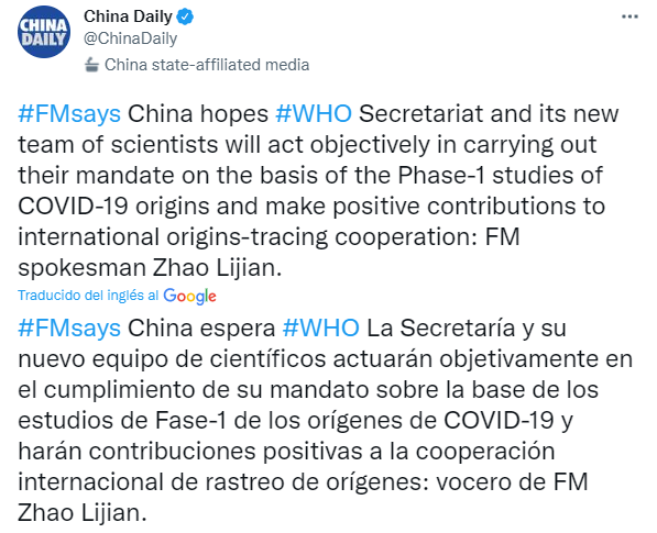 "China seguirá respaldando y participando en el rastreo científico global y se opone firmemente a cualquier forma de manipulación política. Confiamos en que todas las partes implicadas, incluido el secretariado de la OMS y el grupo asesor, mantengan una actitud científica responsable y objetiva”, indicó el portavoz del Ministerio de Exteriores chino, Zhao Lijian.