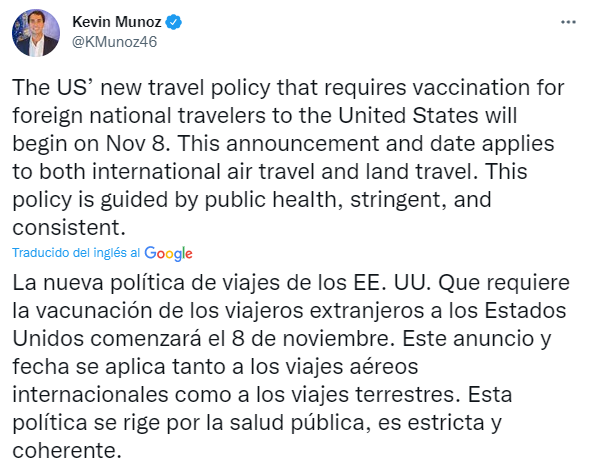 "La nueva política de viaje de EE.UU. que exige vacunación para los viajeros extranjeros a EE.UU. comenzará el 8 de noviembre. Este anuncio y la fecha se aplican tanto a los viajes internacionales aéreos como los terrestres", afirmó.