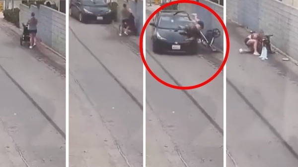 En él se ve cómo una mujer con su bebé en una carriola camina en la banqueta de una solitaria calle, cuando de pronto un automóvil sedán negro en sentido contrario los embiste de lleno.