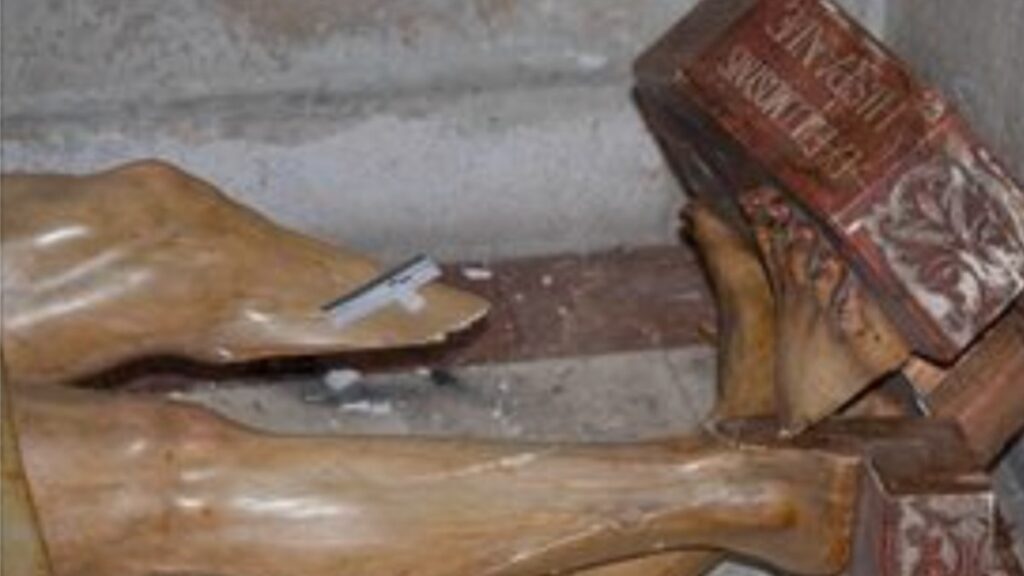 La imagen cayó tras los primeros golpes propinados por el hombre de alrededor de 40 años, por lo que las piernas también se quebraron.