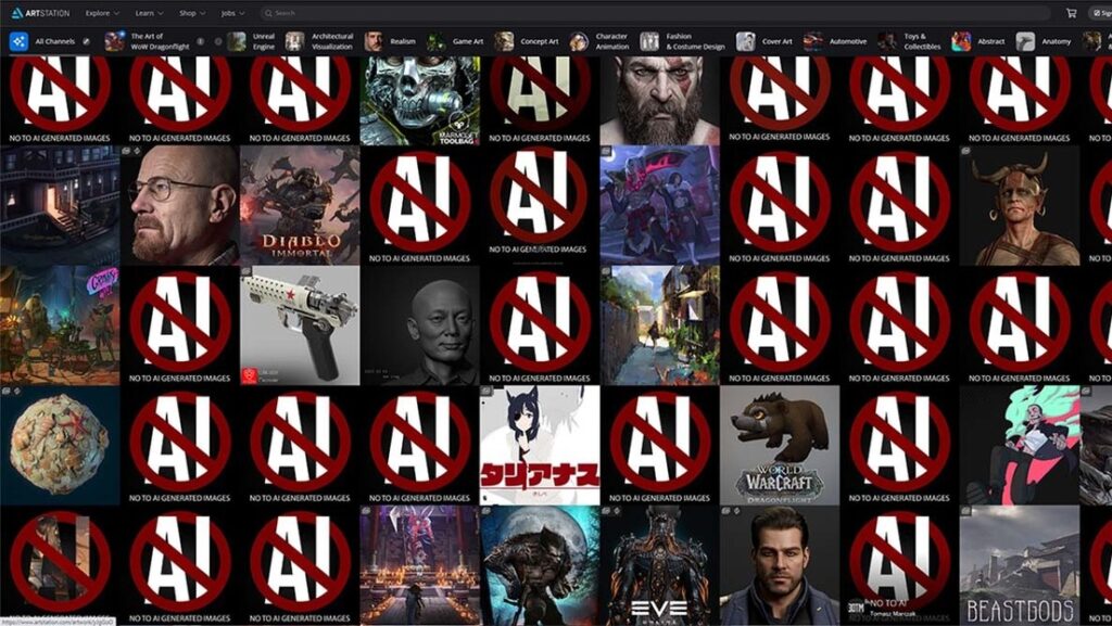 En diciembre de 2022, artistas de todo el mundo se unieron en una protesta masiva en la que reemplazaron sus obras por una publicación que rezaba: "No a las imágenes generadas mediante IA" en la plataforma digital ArtStation. Foto: Especial[/caption]