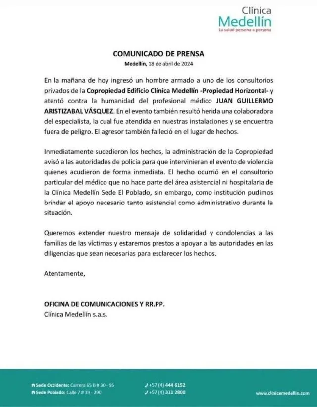 Por su parte, la Clínica Medellín publicó un comunicado en el que brindaron su apoyo a los familiares de las víctimas y expresaron su intención de apoyar a las autoridades en las investigaciones pertinentes.