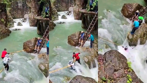 VIDEO Pareja muere ‘tragada’ por una cascada al intentar cruzar con una cuerda