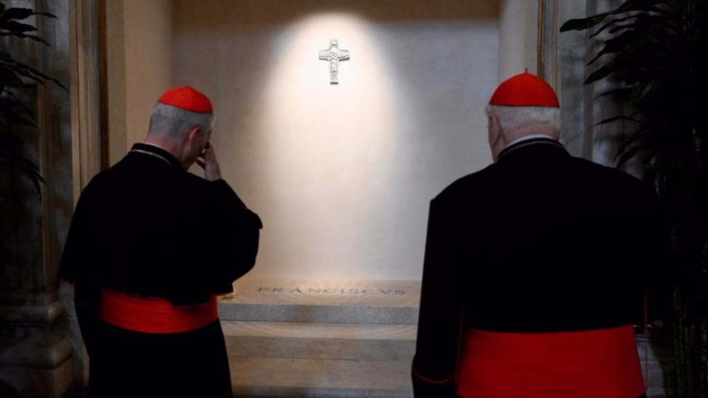 Una luz proyectaba su cálido resplandor sobre el sepulcro y una reproducción de la cruz pectoral del difunto Pontífice se veía en la pared del sitio.