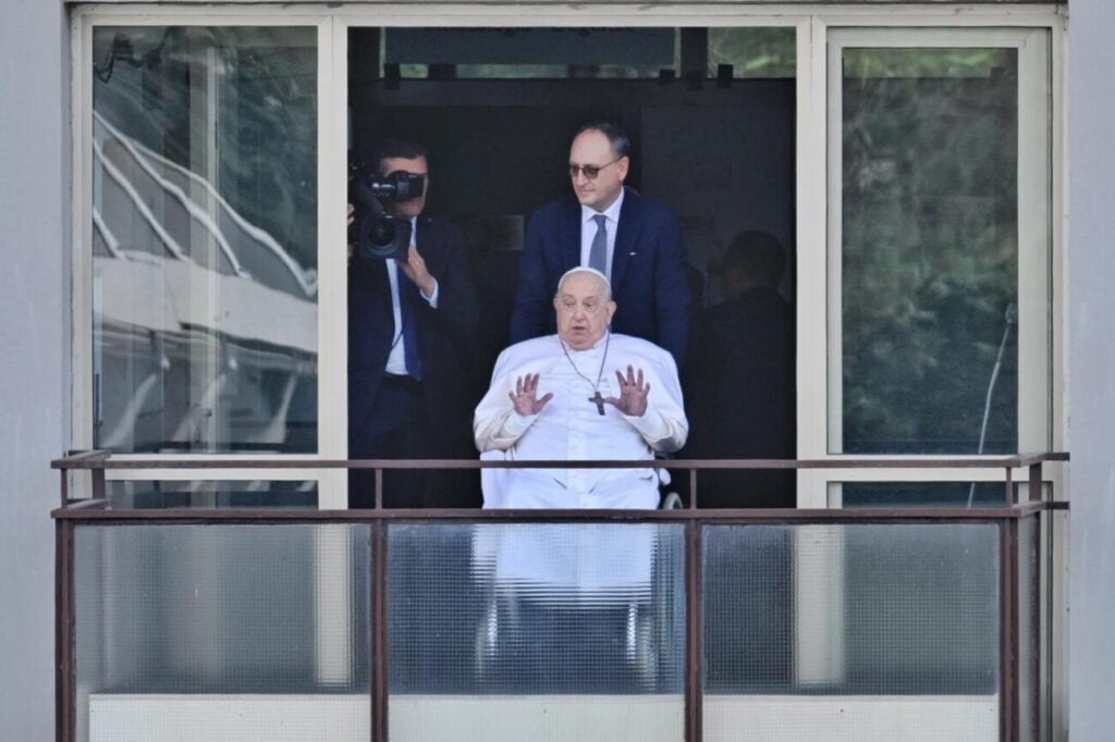 BREAKING: A visibly impaired #PopeFrancis appears at the window of the Gemelli Hospital in Rome for the first time in over a month. He is being discharged for at least two months of recovery to his Vatican Apartment. Even this appearance seems a major strain on the Pontiff. 🙏 pic.twitter.com/NbyIpVzJMD