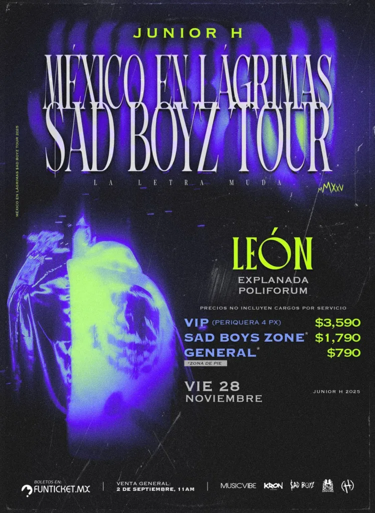 León, Guanajuato - El reconocido cantante guanajuatense de música regional mexicana, Junior H, llegará a León el próximo 28 de noviembre como parte de su esperada gira México en Lágrimas Sad Boyz Tour 2025.