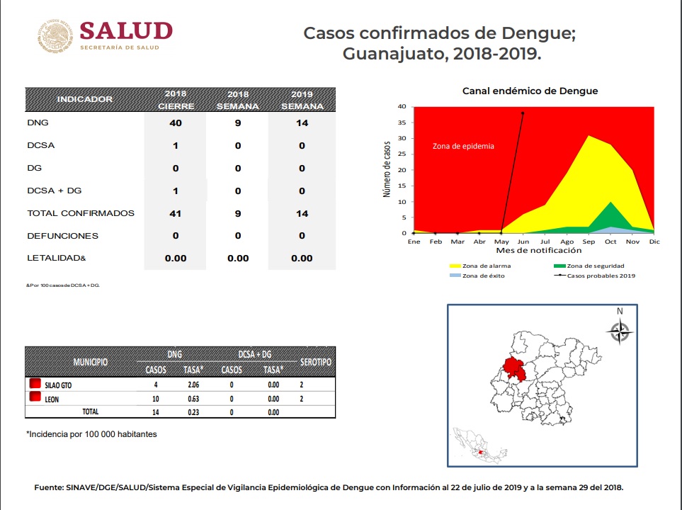 En el Panorama Epidemiológico de Dengue, Guanajuato cerró 2018 con un total de 40 casos de Dengue No Grave (DNG) y uno de Dengue Con Señal de Alarma (DCSA).