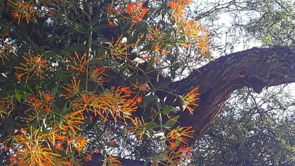 “El muérdago es una planta que se confunde mucho con la llamada “flor de mezquite” pero ni es flor y ni es del mezquite; es una planta color naranja, de frutos parecidos a aceitunas que lo que hacen es “chupar” al árbol al que llegan y lo secan por completo”