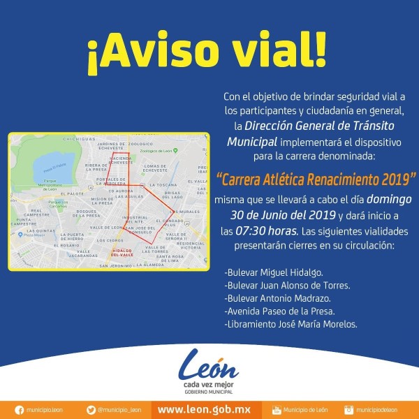 León, Guanajuato. Con el objetivo de brindar una mayor seguridad vial a los participantes y ciudadanía en general, la Dirección General de Tránsito Municipal implementará un dispositivo para la “Carrera Atlética Renacimiento 2019”, que se llevará a cabo el próximo domingo 30 de junio.
