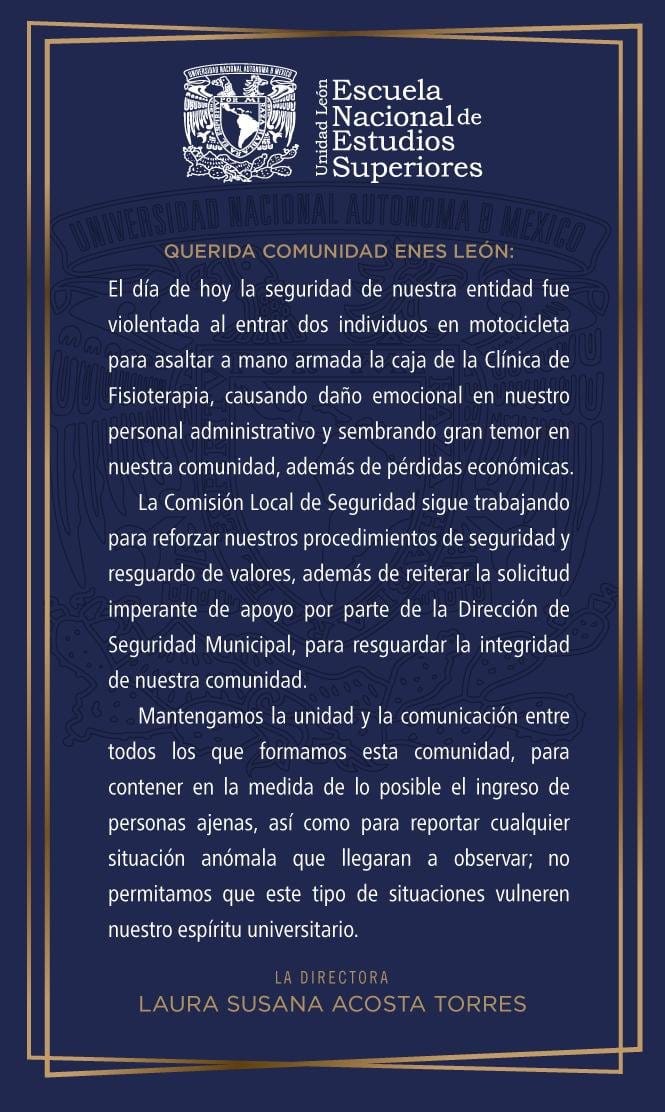 A través de sus redes sociales la Universidad Autónoma de México en León dio a conocer que la tarde de este lunes una de sus cajas fue asaltada.