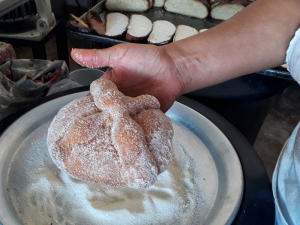 Una vez espolvoreado ya está listo para ponerlo en el exhibidor. Ellos, además de pan de muerto, también preparan galletas con la figura de calaveritas, calabazas y hombres de gengibre.