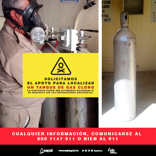 El Sistema de Agua Potable y Alcantarillado de León (Sapal), solicita de la colaboración de todos los ciudadanos para localizar un cilindro tanque de 65 Kg. al 100 % de su capacidad, color plata; que contiene cloro en estado líquido y que al extraerlo de ese recipiente se gasifica, por lo cual puede ser altamente peligroso.