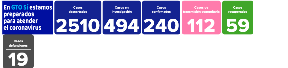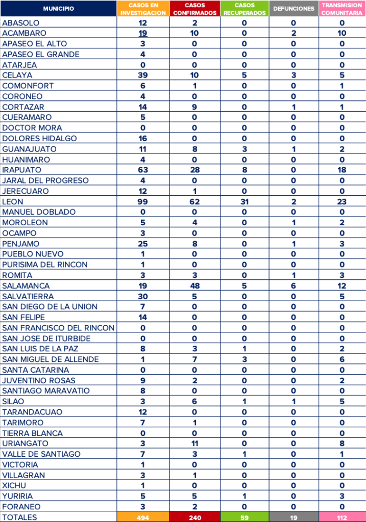 Con ésta ya suman 19 fallecimientos por coronavirus en el estado de Guanajuato. Del mismo modo aumentaron 4 nuevos casos confirmados en la entidad y se sumaron 3 caso a la lista de contagios comunitarios.