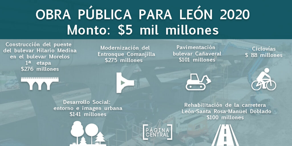 También habrá inversión para obras en el polígono LeónMX en la Feria, el entronque de la carretera Comanjilla con la carretera León-Silao, el Puente Siglo 21 – San Nicolás, que conectará Villas de Barceló con el Polígono de Villas de San Juan, el revestimiento del Río de los Gómez (Central de Abastos), la rehabilitación del drenaje y la red de agua potable en San Miguel o el Coecillo, y la construcción de obras de retención de aguas pluviales en el bulevar Timoteo Lozano.