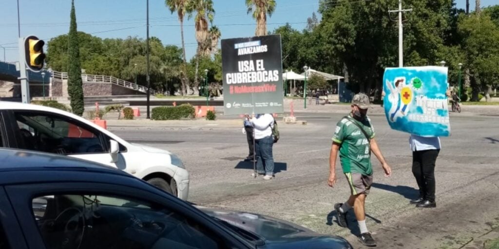 "No mueras por vivir", se lee en una de las pancartas que tratan de concientizar a automovilistas, ciclistas y peatones, es una nueva campaña masiva para evitar contagios de COVID-19.