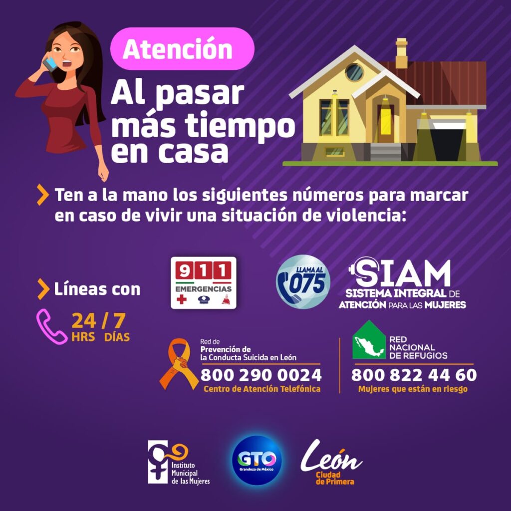 Otra línea de atención psicológica y jurídica es la Línea de Atención Integral a las Mujeres 075, el cual tiene un funcionamiento de 24 horas y es coordinada por el Instituto para las Mujeres Guanajuatenses.