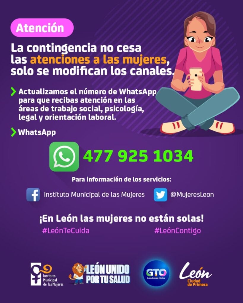 Las mujeres tienen diversas alternativas para tomarlas como sus redes de apoyo, entre ellas se encuentra la línea de WhatsApp: 477 925 1034 que el IMMujeres habilitó en el mes de marzo debido a la contingencia por COVID-19 y que hasta la fecha se mantiene como uno de los canales principales por el que las mujeres solicitan la atención.