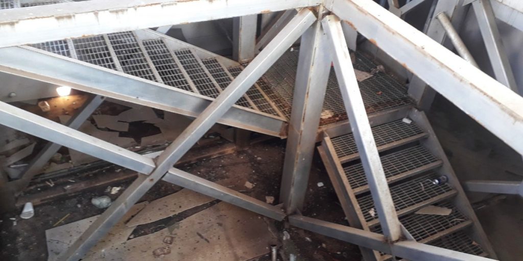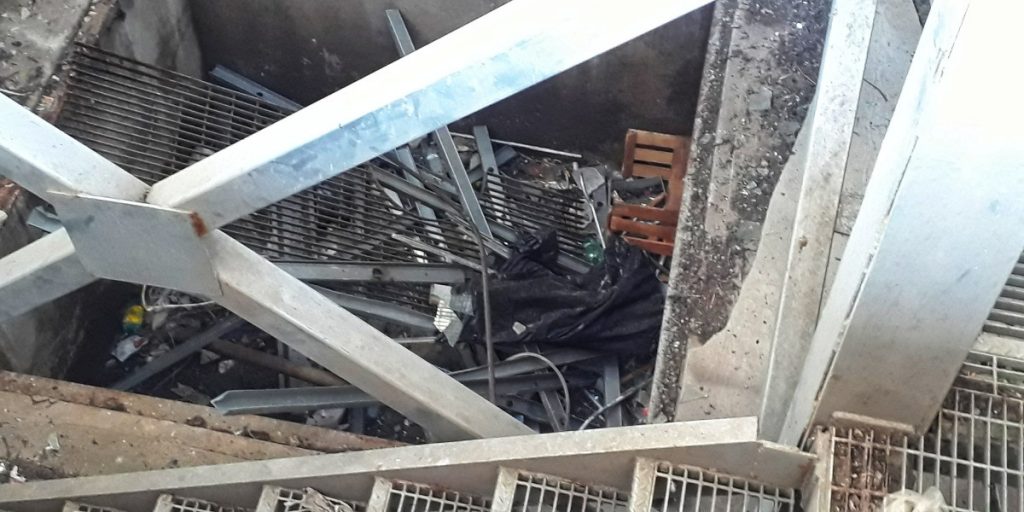 Al entrar, luego de pisar los ventanales rotos, el olor que predomina es el de orines y excremento. Se visualiza de inmediato basura como latas de cervezas, pañales, papeles, ropa vieja y pedazos de hierro retorcido.