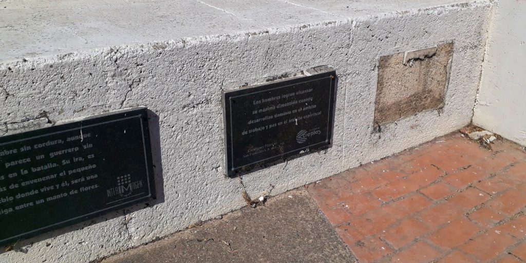 Existe otra placa que muestra la figura estilizada de la torre con la leyenda “Grandeza integrada al futuro”.