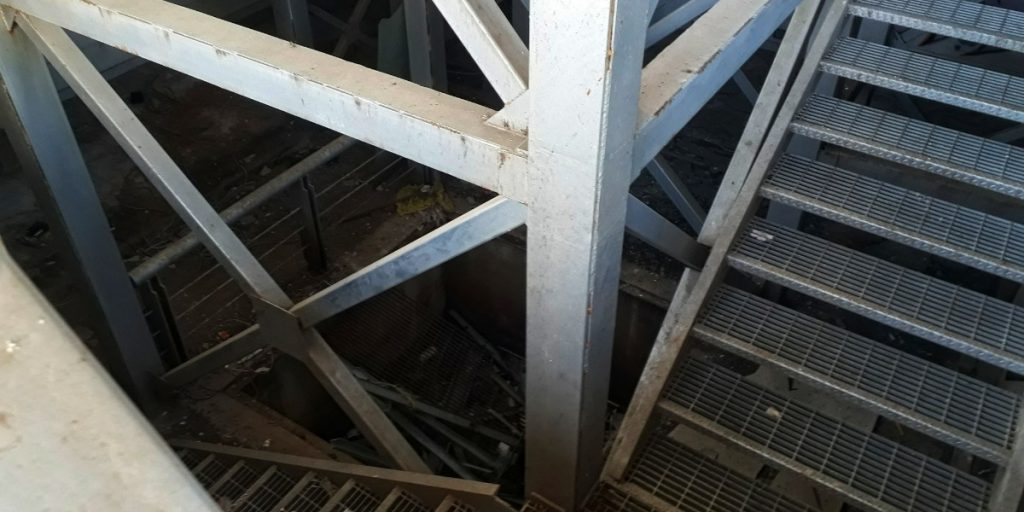 Las rejillas fueron removidas o tal vez robadas, hay grafiti en las paredes y huacales de madera sobre el piso.