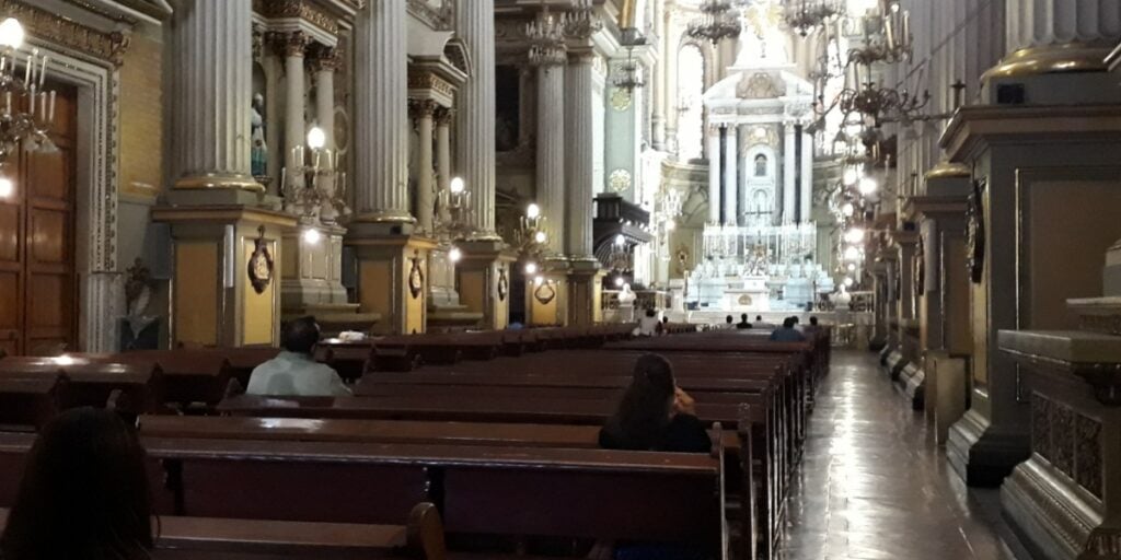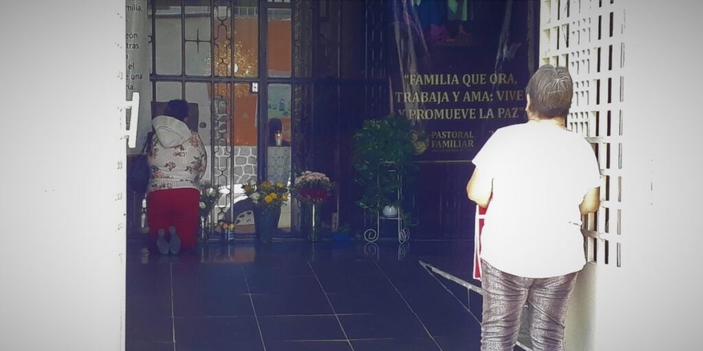 Las puertas de cristal permanecen cerradas y se pueden apreciar las bancas de madera que parecieran estar esperando a los feligreses. Por el pasillo central está la Custodia, donde se coloca la hostia consagrada. La gente llega y trata de tocarla pero el vidrio no lo permite.