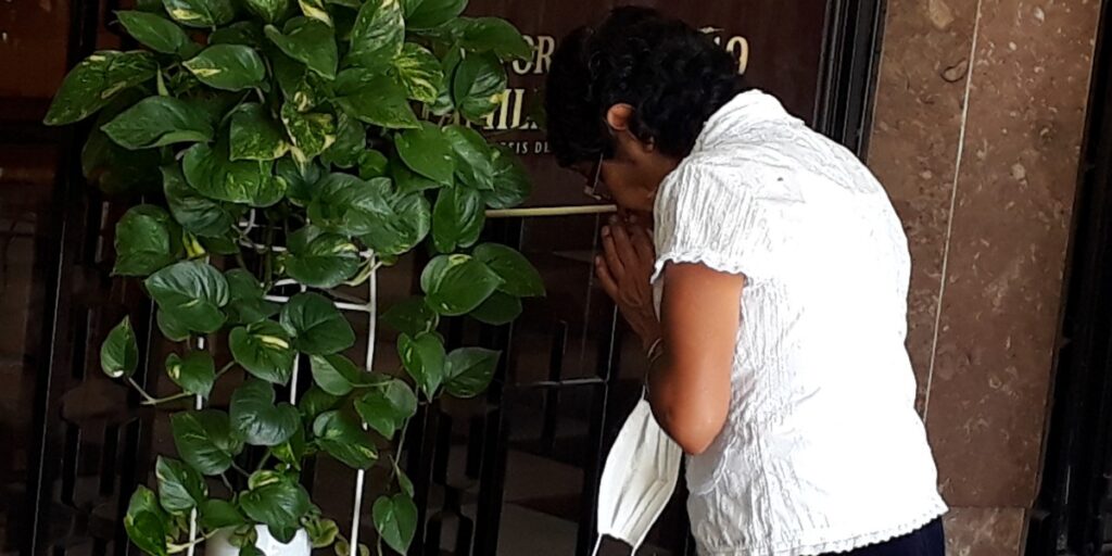Algunos llegan a rezar portando cubrebocas, pero ya al interior del recinto religioso se lo quitan y permanecen haciendo oración hasta por media hora. Luego se retiran sin utilizar gel antibacterial.