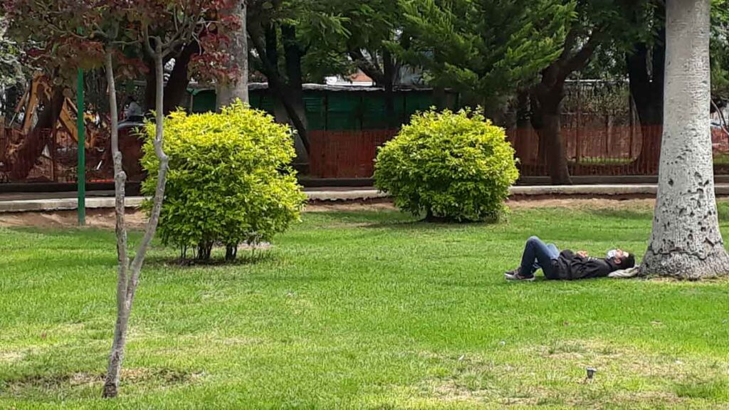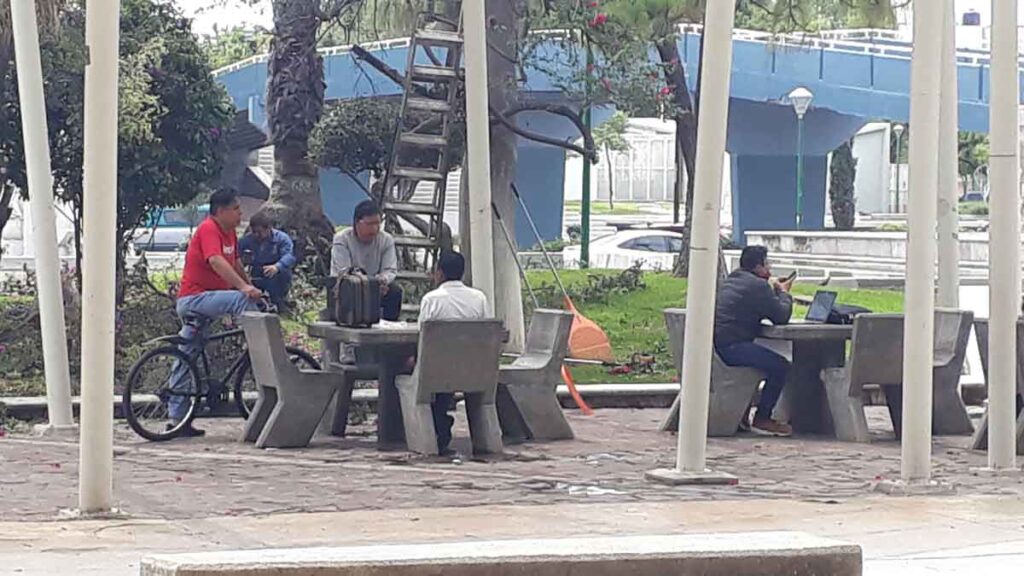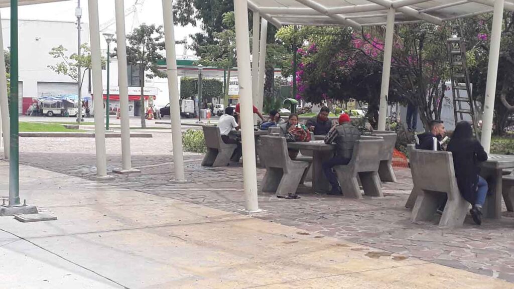En las bancas de esa misma zona al menos unos cinco hombres de la tercera edad pasaban la mañana sin mascarillas o mucho menos gel antibacterial: para ellos la enfermedad es un mito, un invento del gobierno.