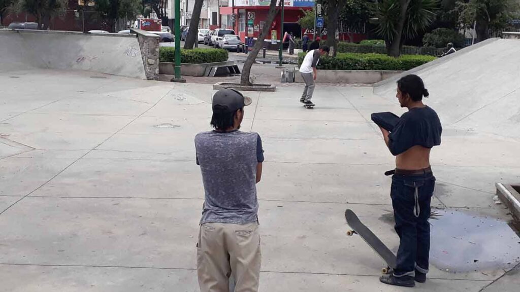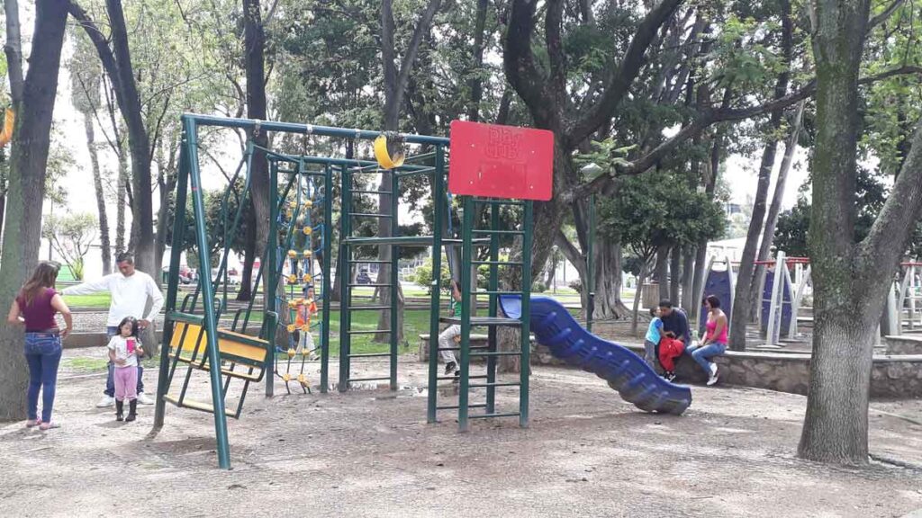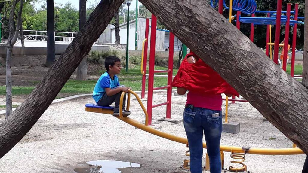La familia estaba conformada por tres niños, un joven y una mujer en silla de ruedas, a unos metros de ahí una pareja joven de papás jugaban con su hijo a un “sube y baja”; ninguno de ellos utilizaba las medidas de higiene mínimas.