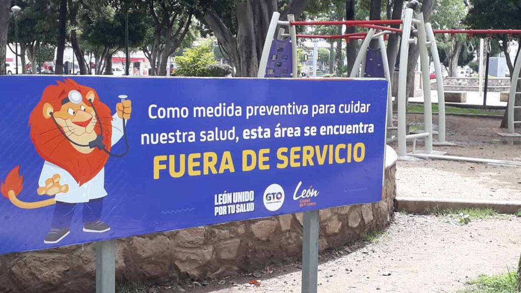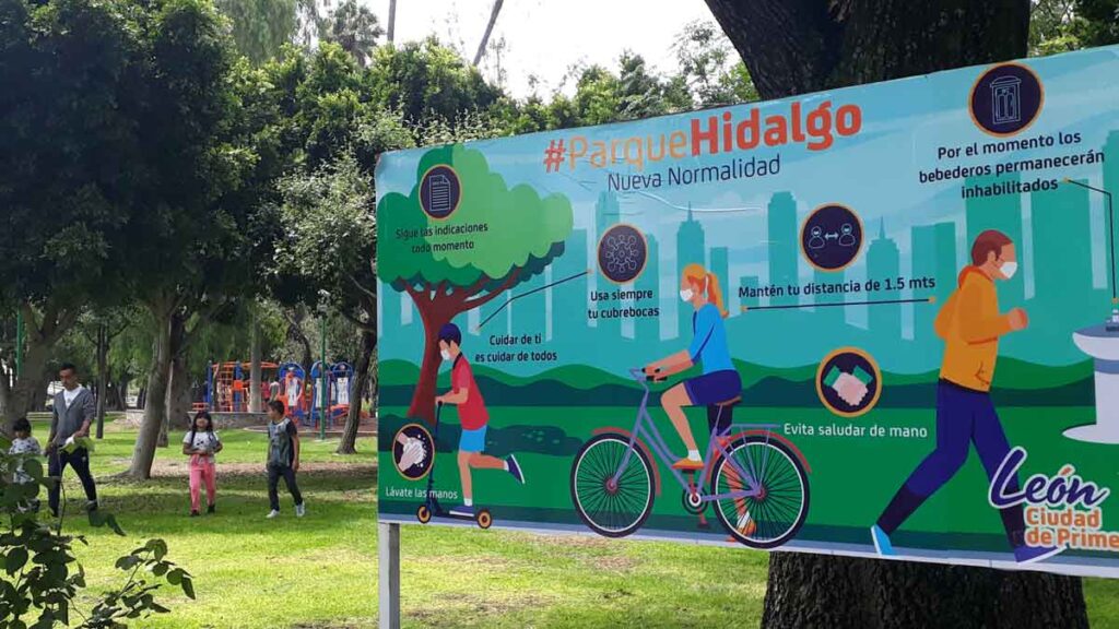 A partir de la llamada “Nueva Normalidad” el municipio colocó anuncios en el Parque Hidalgo; algunos indican las zonas que estarán fuera de servicio hasta que pase la pandemia o cambie de color el semáforo sanitario.