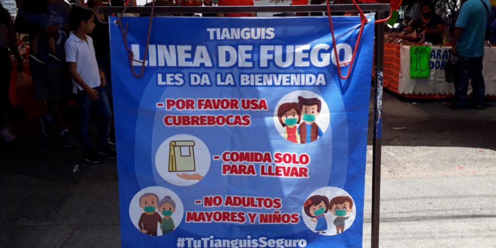 En una de las calles se colocó una lona azul en la que se pueden leer varias recomendaciones como “Por favor, usa cubrebocas”, “Comida solo para llevar” y “No adultos mayores y niños”, pero la mayoría de los asistentes hicieron exactamente lo contrario.