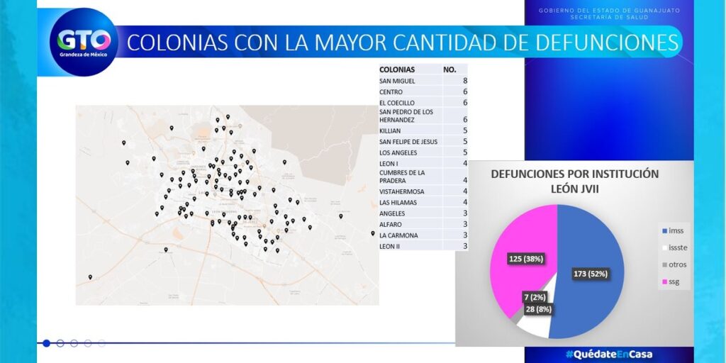 Entre los tres primeros lugares se ubican el barrio de San Miguel con 97 casos y 8 decesos, León II con 81 y 3 decesos; y el barrio de El Coecillo con 6 fallecimientosA continuación el mapa de las colonias afectadas y en donde se implementará la alerta anunciada por la Secretaría de Salud estatal.MEJZ*