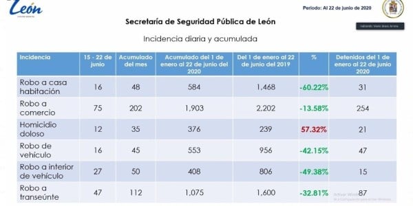 Otros incidentes son el robo a comercio que se redujo en un 13.58% con mil 903 hechos registrados y con un total de 254 detenciones, y el robo a transeúnte que refiere una baja del 32.81% con mil 75 casos reportados de enero a junio de 2020 contra mil 600 en el mismo periodo de 2020.