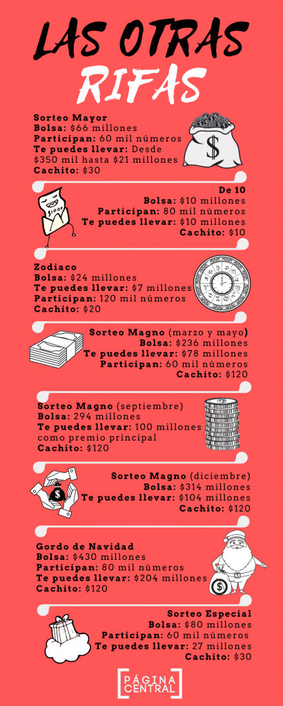 Hay otros sorteos como el “De Diez” que se juega los miércoles, con 80 mil números y una bolsa semanal de poco más de 19 millones; los viernes se celebra el Sorteo Superior con una bolsa de 51 millones 833 mil pesos, participan 60 mil billetes.