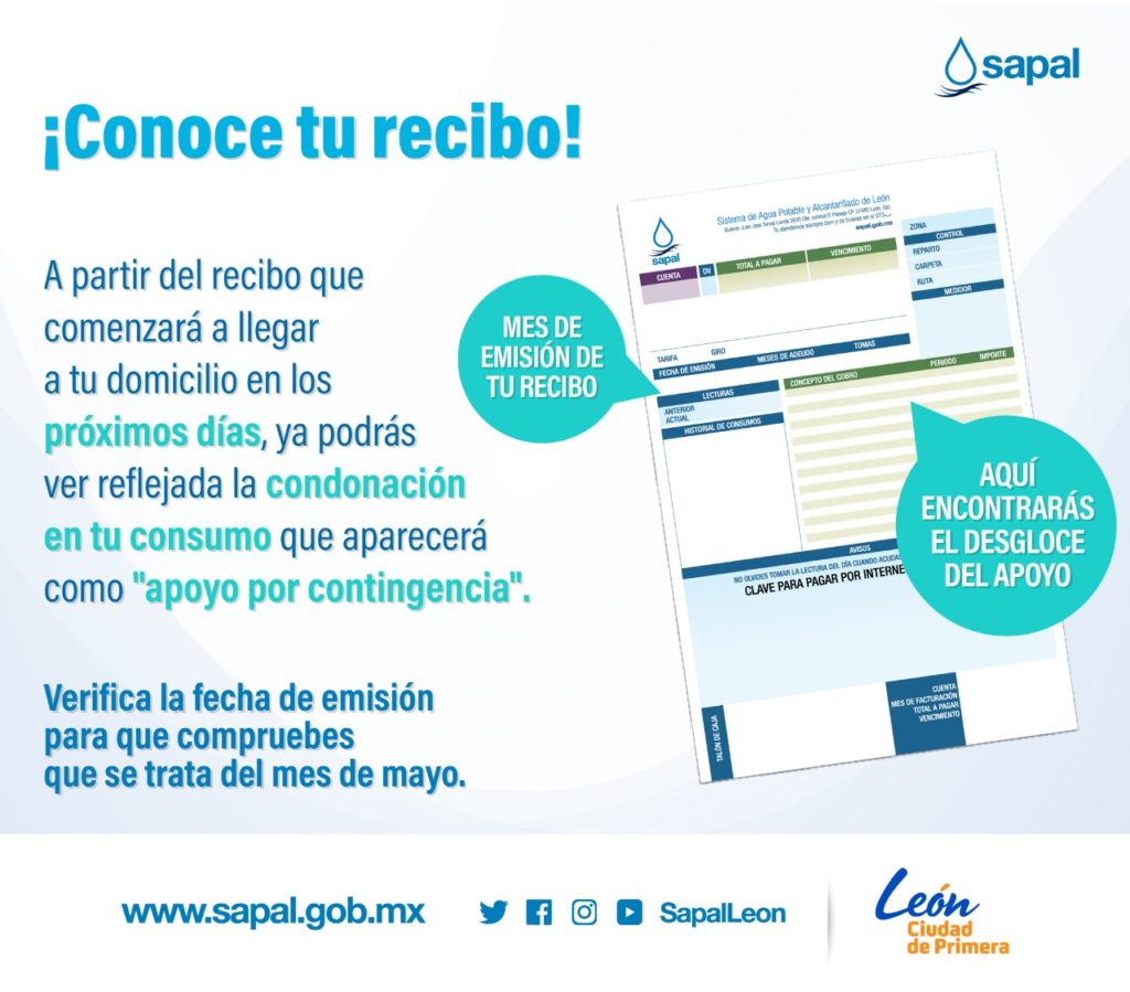 El Sistema de Agua Potable y Alcantarillado de León (Sapal), informa que desde el lunes 11 de mayo, inició la entrega de los recibos de agua con la condonación del servicio en distintas colonias del Municipio.