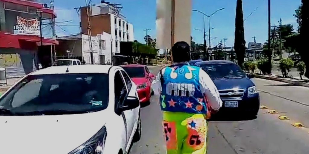 Con un sol a plomo sortea los autos. El payaso urbano levanta con fuerza una cartulina fluorescente con mensaje contundente: "Tengo dos meses sin trabajo, apóyame", leen los automovilistas, mientras el semáforo lo permite.