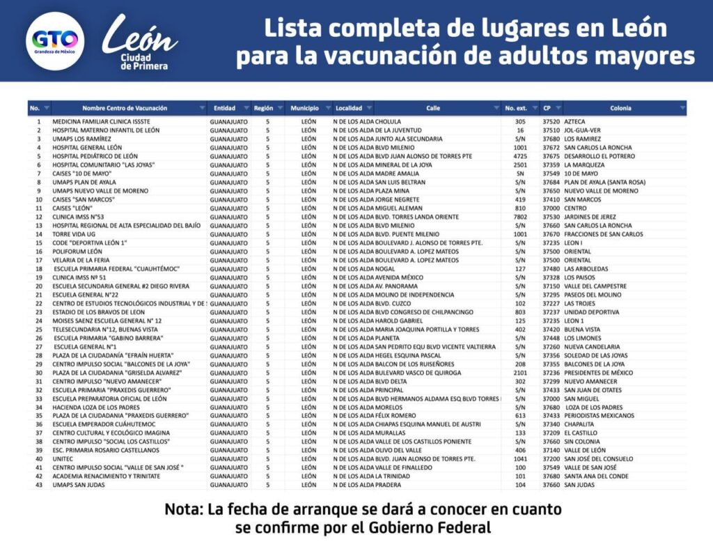 Este domingo llegarán al estado de Guanajuato 146 mil dosis de la vacuna del laboratorio AstraZeneca que serán distribuidas en más de 30 puntos diferentes del municipio de León, con la finalidad de inmunizar a los adultos mayores.