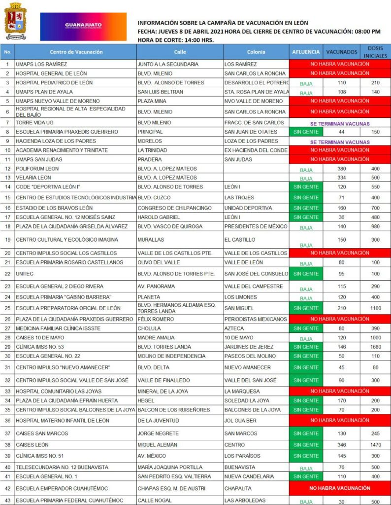 Consulta aquí los módulos de vacunación en el municipio de León con menor afluencia y más cercanos a ti. No olvides acudir usando tu cubrebocas.