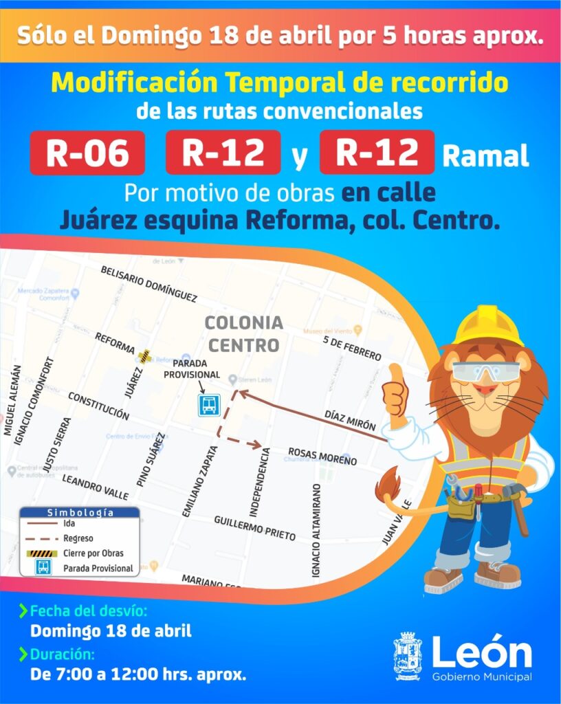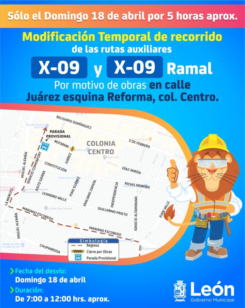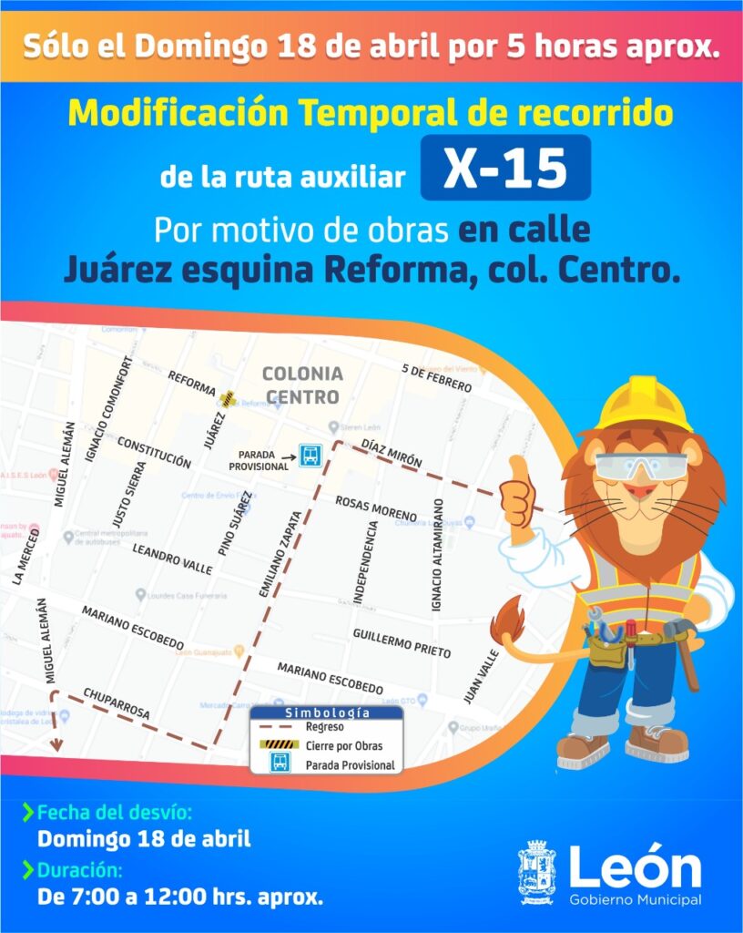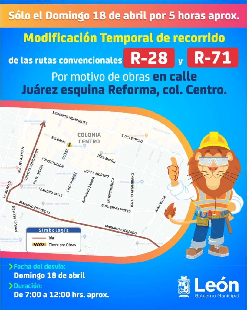 Por motivo de obras, el Municipio de León informó que el próximo domingo 18 de abril, el cruce de la calle Juárez y Reforma del Centro Histórico permanecerá cerrado durante la mañana, por lo 14 rutas de transporte sufrirán desvíos provisionales.