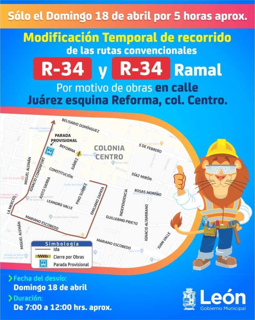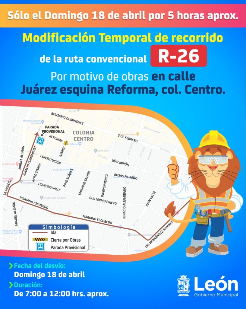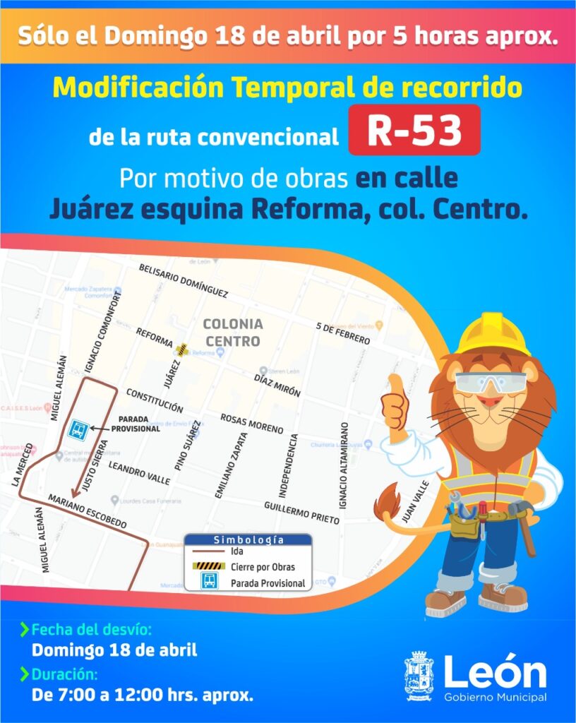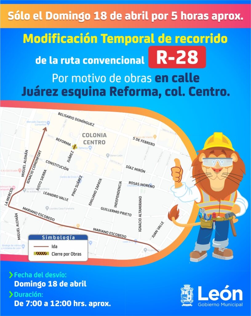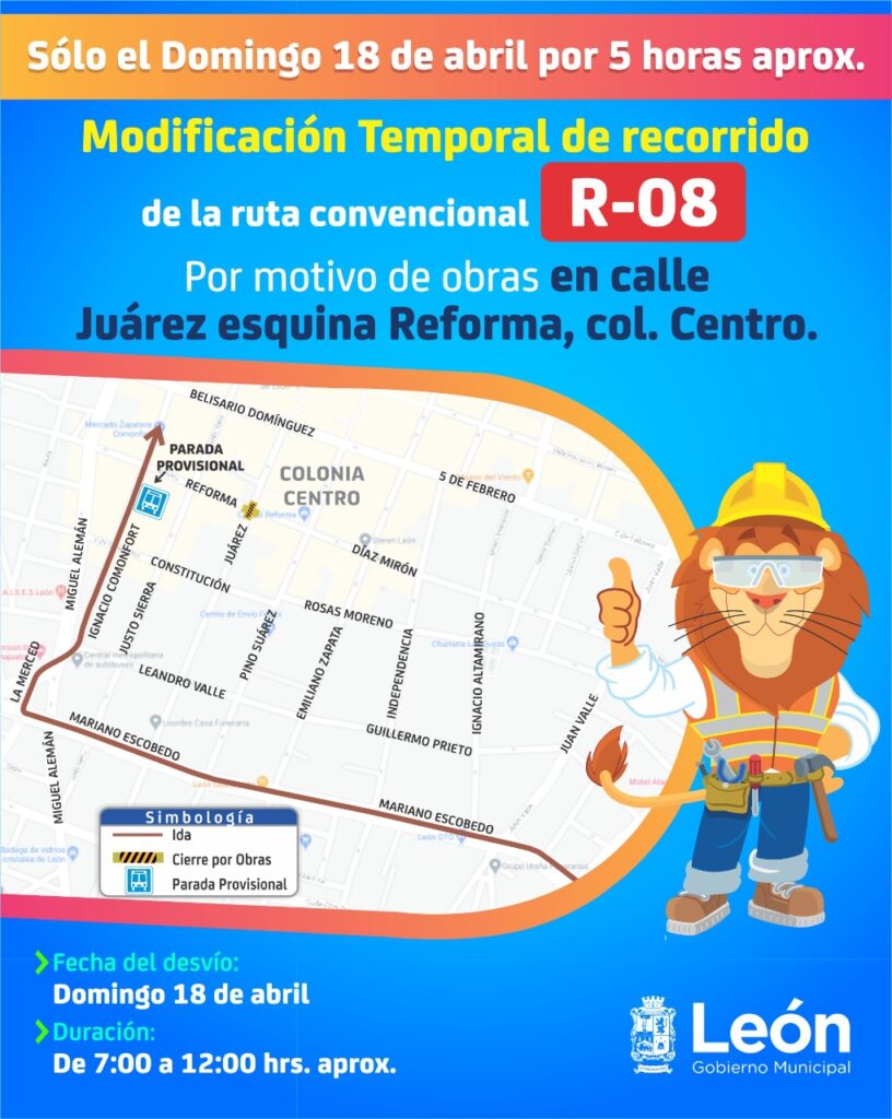 Por motivo de obras, el Municipio de León informó que el próximo domingo 18 de abril, el cruce de la calle Juárez y Reforma del Centro Histórico permanecerá cerrado durante la mañana, por lo 14 rutas de transporte sufrirán desvíos provisionales.