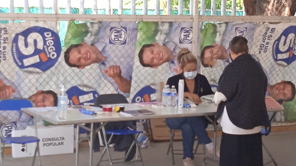 “Al llegar a la mesa de recepción de la consulta observé que se colocaron mantas del proceso electoral 2018 con la imagen del actual gobernador Diego Sinhue Rodríguez Vallejo y del partido político que lo postuló, el PAN, en una clara violentación a las reglas de equidad de esta jornada”.