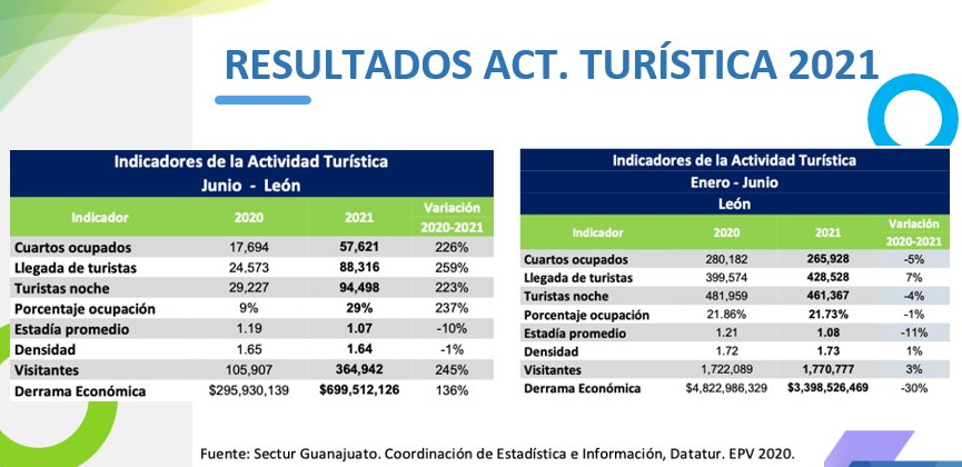 En el tema de visitantes, que creció un 3% las cifras advierten que para el 2020 la ciudad del calzado recibió un millón 722 mil 89 personas contra un millón 770 mil 777 en la primera mitad del 2021.
