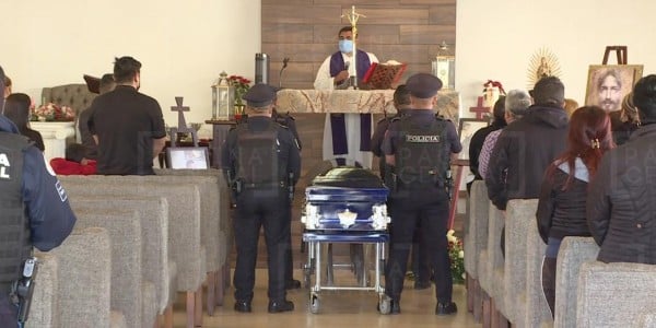 En el cortejo fúnebre está Alejandra Gutiérrez Campos, presidenta municipal. La misa de cuerpo presente es el tercero de sus eventos del día. El primero fueron los honores a la bandera, en donde anunció cambios en los protocolos policiales y apoyo para las familias.
