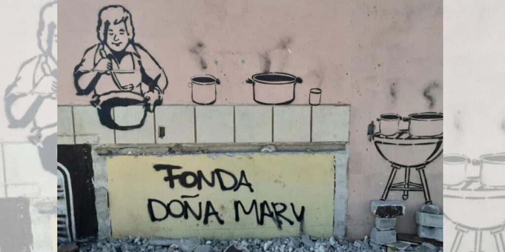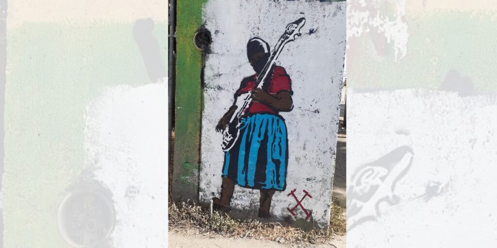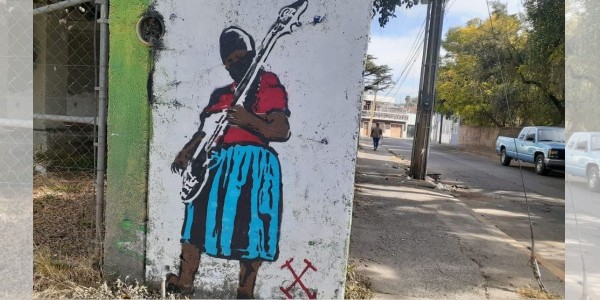 La intervención urbana va tomando forma. Sobre el fondo blanco reposa la silueta de una mujer de aspecto indígena. Es una zapatista tocando una guitarra eléctrica. Cuando piensa en el siguiente diseño se deja llevar por lo que pasa por su cabeza en ese momento. En esta obra plasma su respeto hacia la lucha y el eco de la música que cruza fronteras. A menos de un kilómetro, otra de sus piezas cuenta una historia diferente.